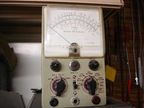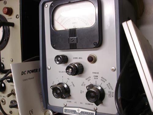 Multi-Meters Here are the primary multi-meters used on my workbench. You'll see a Fluke 8050A Benchtop DMM (most used piece!), a Military MilliOhm Meter used for exact measurement of small resistances, a HP VTVM, and an old Heathkit VTVM. The VTVMs (Vacuum Tume Volt Meter) are great when you need a very high impedance meter that doesn't react with the circuit under test. The old Heathkit VTVM is more of a nostalgic piece for my bench than anything else, though it does work OK. |