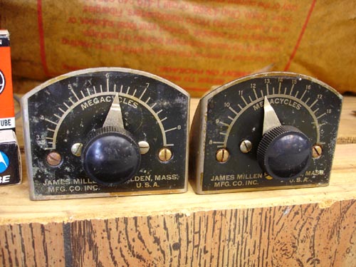 James Millen Frequency Meters These old frequency meters are mostly a display item, as there are much better ways to measure resonance these days. These were manufactured by the James Millen Company back around 1947. One would hold these near a tuned circuit, watch the current of the circuit in question, rotate the knob until a dip in current in the circuit was noticed, and this would be the approximate frequency or resonance. Just a cool piece of history, they are! |