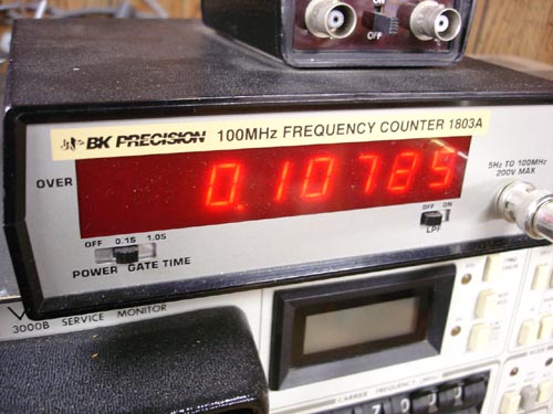 B&K Frequency Counter I've had this counter since at least 1986, and it's been tough. I've accidentally transmitted into the input wihtout harm, and it has run for week on end when I'd forget to turn it off. Since it's in the vicinity of Studio B, I also use it to watch the output frequency of my old vintage transmitters. I also have an external 1ghz prescaler, but it's currently on the fritz... |